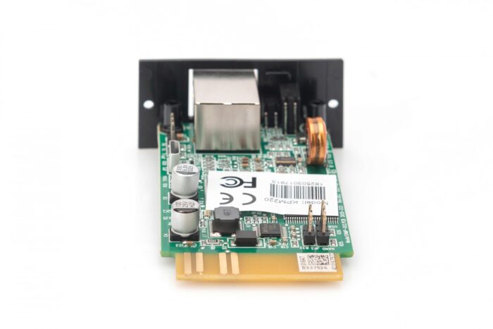Digitus SNMP and WEB Card for OnLine UPS Units. This is a network management card that comes in black. It features LED indicators for activity, link, power, and status. The card supports various network protocols including TCP/IP, UDP, SNMP, SSL, Telnet, HTTP, SMTP, DHCP, DNS, and more. It has an RS-232 interface type and supports Fast Ethernet with Ethernet LAN data rates of 100 Mbit/s. The input voltage ranges from 8 to 15 volts. The dimensions of the card are: width 52 mm, depth 81 mm, and height 26 mm.