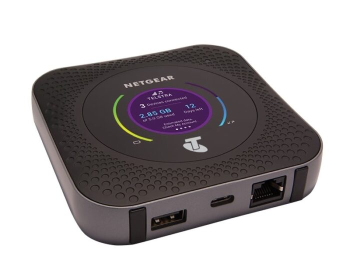 The NETGEAR MR1100 is a cellular network router designed for portability, featuring a sleek black appearance. It is equipped with a Gigabit Ethernet LAN interface that supports data rates of 10, 100, and 1000 Mbit/s and is compatible with the IPv6 network protocol. For wireless connectivity, the router supports Wi-Fi standards 802.11a, Wi-Fi 5 (802.11ac), 802.11b, 802.11g, and Wi-Fi 4 (802.11n), with WLAN data transfer rates of up to 150 Mbit/s. In terms of cellular networks, it supports 3G, 4G, and LTE, with 3G standards including WCDMA and a 4G standard of LTE. The device comes with USB ports, including USB Type A and USB Type-C, and is compatible with MicroSD (TransFlash) memory cards.
