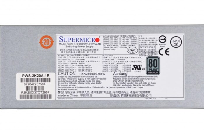 The Supermicro PWS-2K20A-1R is a power supply unit with a total power output of 2200 watts. It supports an AC input frequency range of 50 to 60 Hz and boasts an impressive efficiency of 96 percent. Designed in a 1U form factor, this PSU is silver in color. It meets various compliance standards, including RoHS, and is certified under REACH. The dimensions of the unit are 76 mm in width, 40 mm in depth, and 336 mm in height.